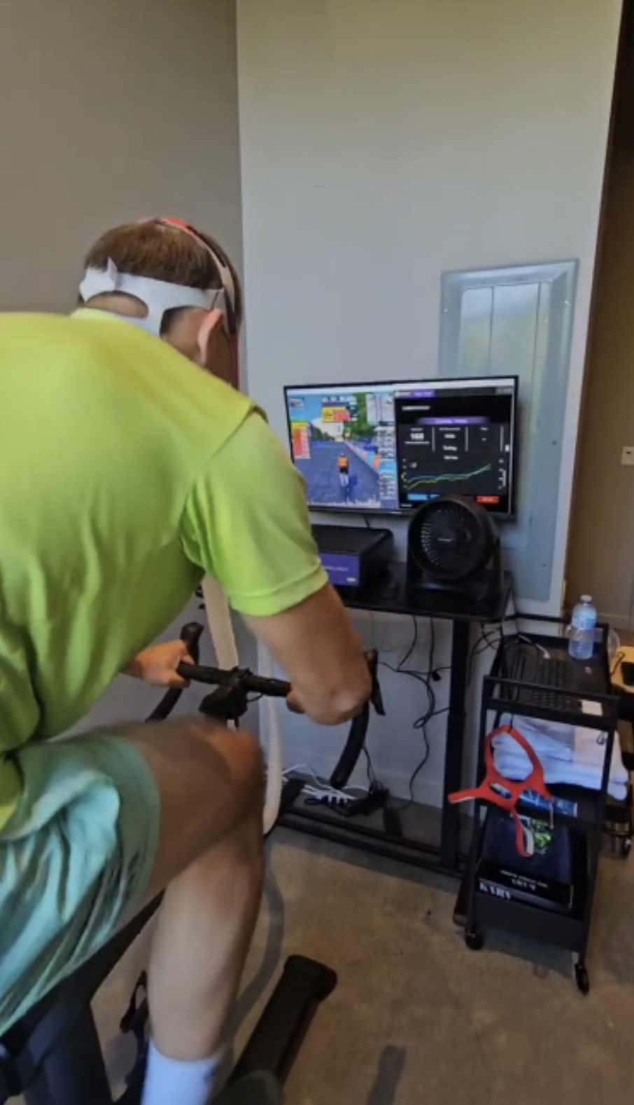 When you arrive, we'll give you a quick rundown of how the tests will go. Then you will be fitted with a special mask that measures your oxygen consumption. You'll peddle on a stationary bike that gets progressively harder until you can't anymore.